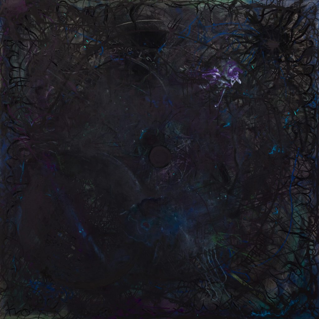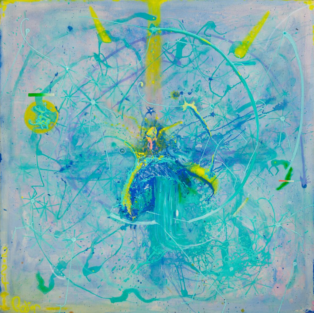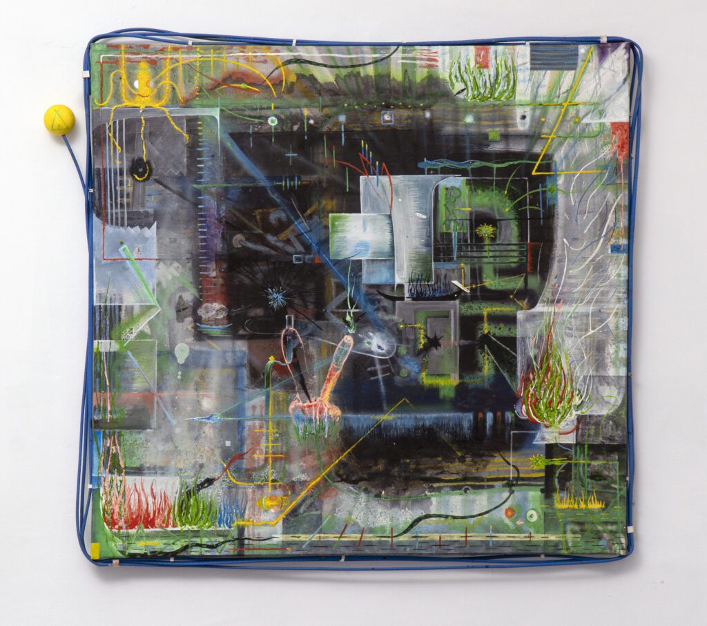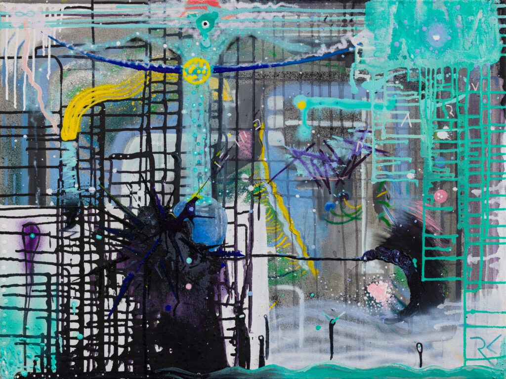 Each painting by Radim Koros constitutes a cosmos. Constellations of rachitic tendrils are punctuated by rays of multicolored lights and strings of signs of alien alphabets. The biomorphic garlands seem to want to become wiring or a full of LED chips.