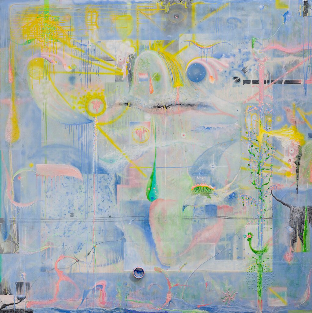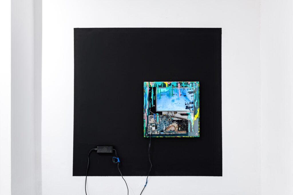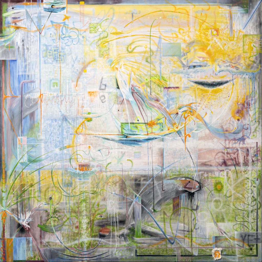 Each painting by Radim Koros constitutes a cosmos. Constellations of rachitic tendrils are punctuated by rays of multicolored lights and strings of signs of alien alphabets. The biomorphic garlands seem to want to become wiring or a full of LED chips.