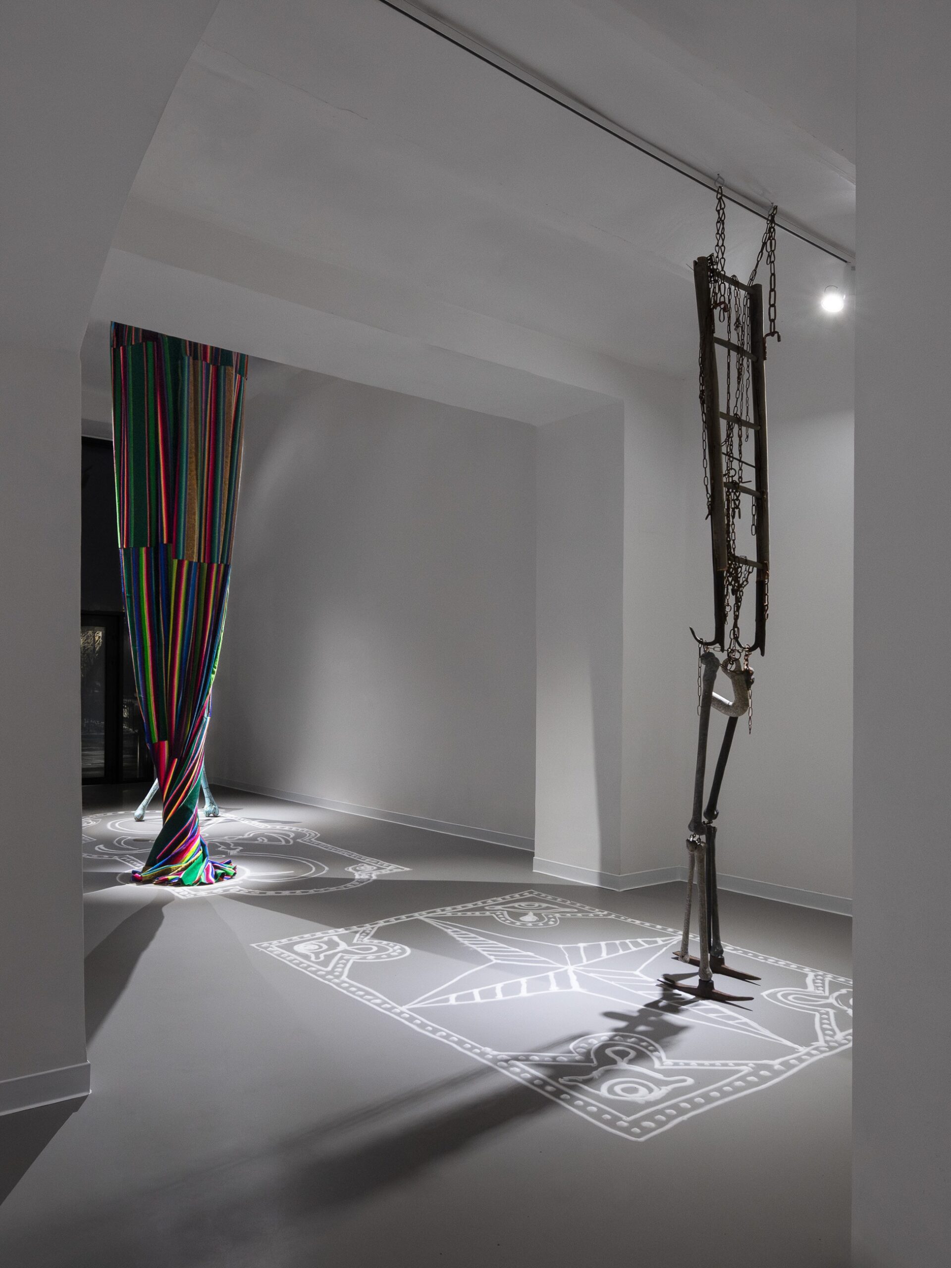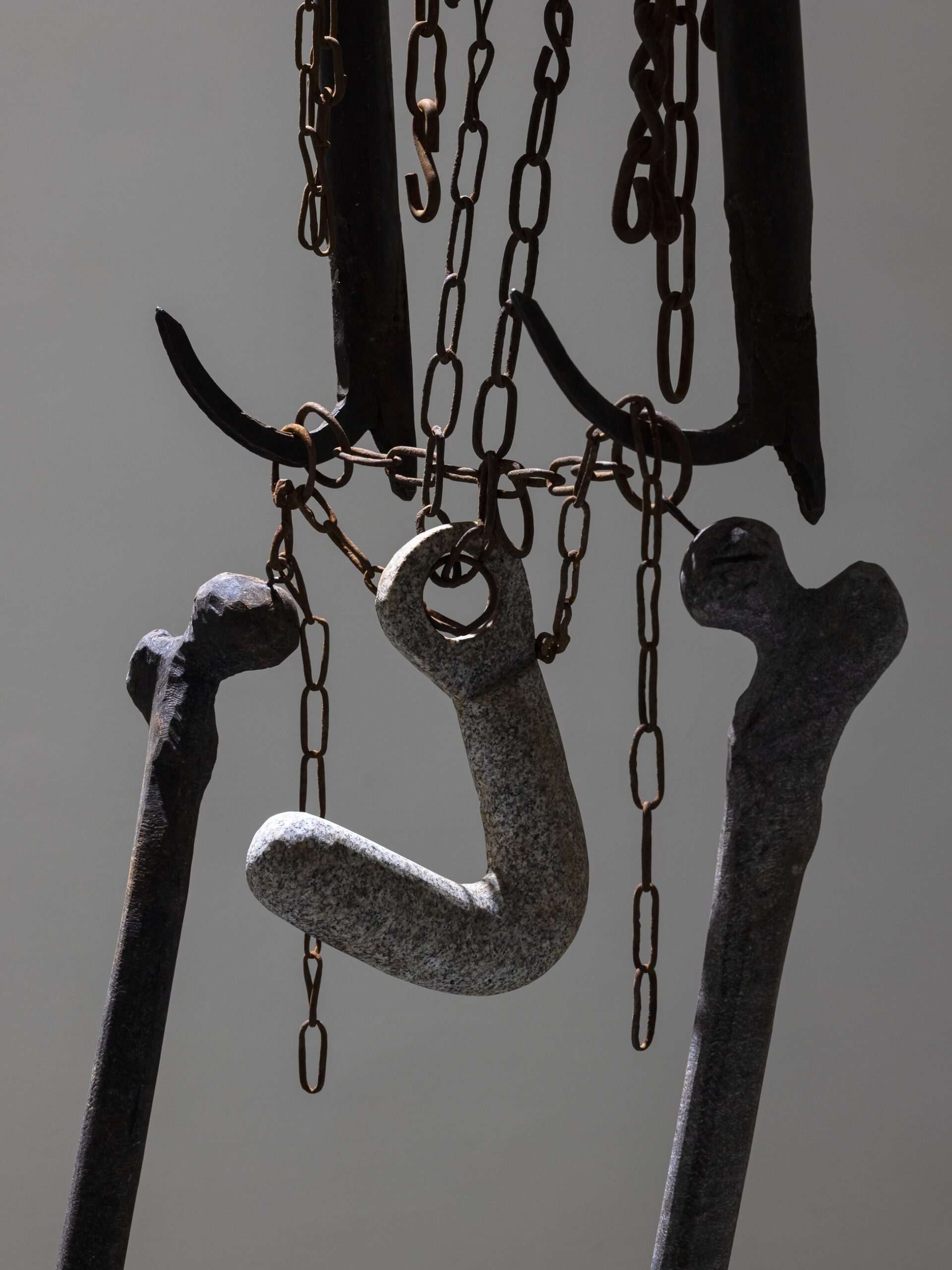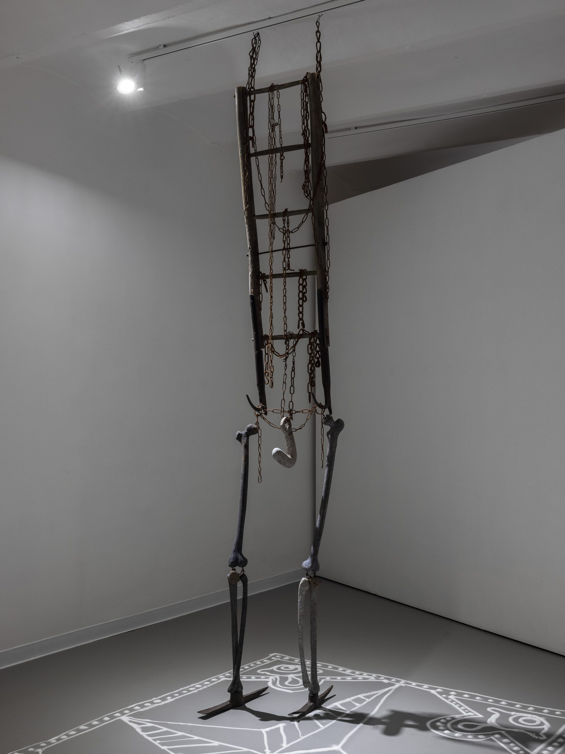 The work brings together multiple artistic traditions: from monumental Socialist Realist sculpture with its homoerotic predilection for powerful figures of labour vanguards, through the Surrealist objects of Władysław Hasior and elements of Kantor’s imaginarium, to the Italian movement of arte povera. The enormous striding figure is constructed from mining tools — pickaxes, ladders, chains — set against granite bones and silver ore. This work is one of a series in which Okoński confronts the elements of gender stereotypes and the imaginings that shape national identity, as present in Polish culture.